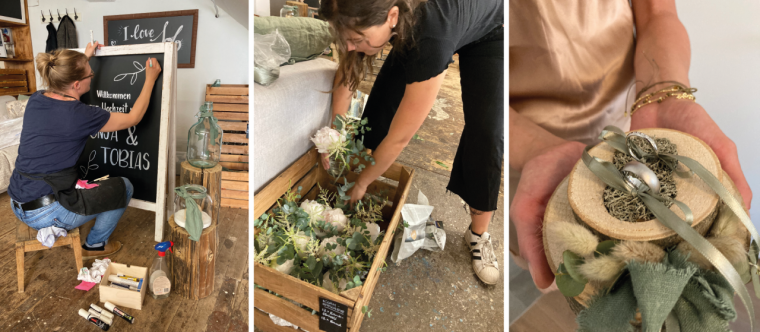 Ein Blick ins Atelier von kreationell verspricht viel Heimeligkeit und versprüht so wahnsinnig viel Liebe. In der durch Wärme geprägten Atmosphäre entstanden liebevoll gestaltete Tisch- und Raumdekorationen sowie Menu Karten. Wobei in diesem Fall die Hochzeitsgäste das Menu auf Schwarzschieferstein entnehmen konnten. Als besonderes Highlight für das Brautpaar kreierte und gestaltete kreationell die passende Box für die Trauringe. Wobei auch hier der Begriff “Box” nicht ganz trefflich ist. Vielmehr ein sorgfältig gestaltets, handgrosses Tableau, das die Trauringe unaufdringlich in den Mittelpunkt stellte.
