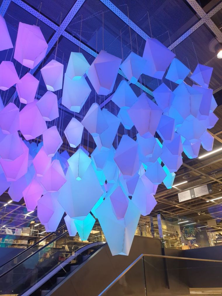 Das Team rund um Sandra Kull konzipierte eine LED-Installation in Diamantenform mit 200 Lampen in drei verschiedenen Grössen. Die Kunststofflampe kann vier verschiedene Programme mit unterschiedlichen Farben und Effekten zum Besten geben. Beim Programm «Entrance» wird man durch den Lichtfluss nach oben gezogen, während die «Polarlights» ein Lichtspiel darstellen, die an die Polarlichter erinnern. Wer in den Genuss von «Bloom» kommt, erlebt verschiedene, farbige Blumenpunkte, die aufblühen und passend zur Jahreszeit ist das Programm «Christmas», welches weisse, glitzernde Lichter mit Goldakzenten abspielt, die mit Sparkling-Effekten aufblitzen.