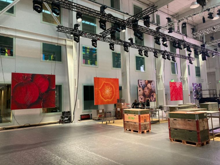 Giulia Da Tos wird den Goldenen Koch-Event nicht so schnell vergessen: «Einerseits mussten wir natürlich die ganzen Corona-Vorschriften einhalten und durften uns nur mit Masken auf dem Aufbaugelände bewegen. Und andererseits fand der Event in einer speziellen Location statt – der grossen Haupthalle im Trafo Baden.» Die grosse Halle im Trafo ist durch ihre hohe Decke und die farbigen Fenster sicherlich ein Eyecatcher. Jedoch stellt sie auch eine besondere Herausforderung dar, denn es ist nicht einfach, eine so grosse und vor allem derart hohe Halle so zu gestalten, dass die einzelnen Elemente nicht im Raum verloren gehen. Aber durch den Einsatz von grossen Bildern echter Lebensmittel-Fotografien sowie der hängenden Elemente, konnte diese Herausforderung bestens gemeistert werden, wie Giulia Da Tos berichtet.