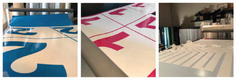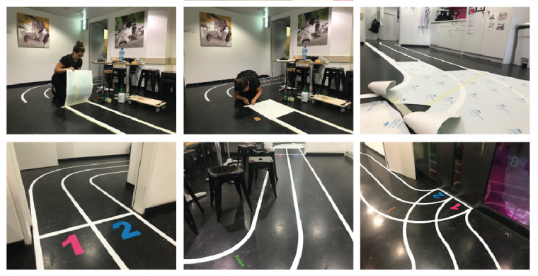 Für die Herstellung von Modellen reichte das Budget nicht aus und deren Nutzen wären in diesem Fall gering gewesen. Stattdessen arbeitete die erfahrene Gestalterin mit Plänen und Materialmustern, wie sie erklärt: «Ich habe jeden Bogen und jede Linie der Laufbahn grafisch dargestellt und ausgerichtet. Und zwar so, dass ich die Umsetzung in Originalgrösse ausführen konnte». Die Produktion der speziellen Folien war sehr aufwändig und musste in kurzer Zeit abgewickelt werden. Den grössten Teil bewältigte die Zürcherin alleine – teils war sie jedoch aufgrund der enormen Dimensionen auf eine helfende Hand und grössere, externe Atelierräumlichkeiten angewiesen. Die grösste Herausforderung bestand schlussendlich darin, alle Teile der Laufbahn exakt aufeinander abzustimmen und zu einem grossen Ganzen zu vereinen: «Ich musste mich auf meine Messungen vor Ort verlassen, da die Pläne, welche mir zur Verfügung standen, nicht massstabgetreu waren. Für die Erstellung neuer Pläne blieb jedoch weder Zeit noch Geld.»