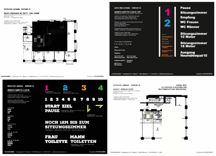Anschliessend setzte sie sich intensiv mit verschiedenen Sport-Laufbahnen auseinander und besuchte einige, um vor Ort Erfahrungen über deren Einzelheiten zu sammeln. Dazu kamen verschiedene Abklärungen in der Planungsphase, wie die Gestalterin erzählt: «Einige Dinge waren anfangs unklar und so galt es, die richtigen Fragen zu stellen: Wie lange soll die Laufbahn die Büroräumlichkeiten zieren? Wo soll die Bahn überall durchgehen? Wie gross soll sie sein?» Auch betreffend Materialien mussten einige technische Dinge in Erfahrung gebracht werden. Dazu kamen gestalterische Details wie Startzahlen oder Sonderzeichen. Der Kunde musste sich zudem entscheiden, wie wahrheitsgetreu die Laufbahn aussehen sollte. Er entschied sich für eine Laufbahn nicht ganz in Originalgrösse, farblich abstrakt und passend zu ihrem CI/CD. Und so begann Eveline Schritt für Schritt mit der Anfertigung ihrer Skizzen.
