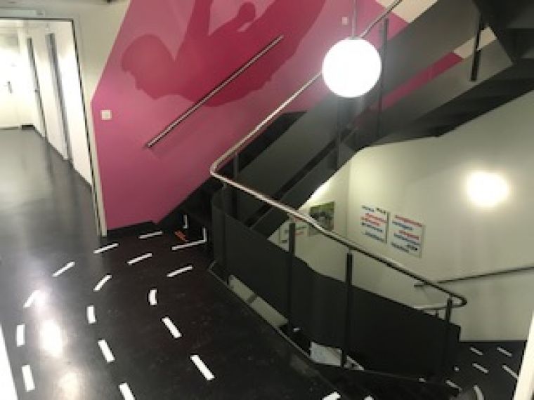 Ebenfalls von A bis Z zuständig war die Zürcherin diesen Sommer für ein einzigartiges Projekt des Sportamts des Kantons Zürich, einer ihrer bestehenden Kunden. Sie beauftragten Eveline mit der Inszenierung einer Laufbahn – quer durch die Gänge und Treppenhäuser ihrer Büroräumlichkeiten. «Das Team hatte mir seine Anforderungen an die Umsetzung zusammengetragen, die wir beim Briefing vor Ort diskutierten. Dabei konnten ich einige technische und gestalterische Fragen mit ihnen klären», erklärt die Polydesignerin3D.