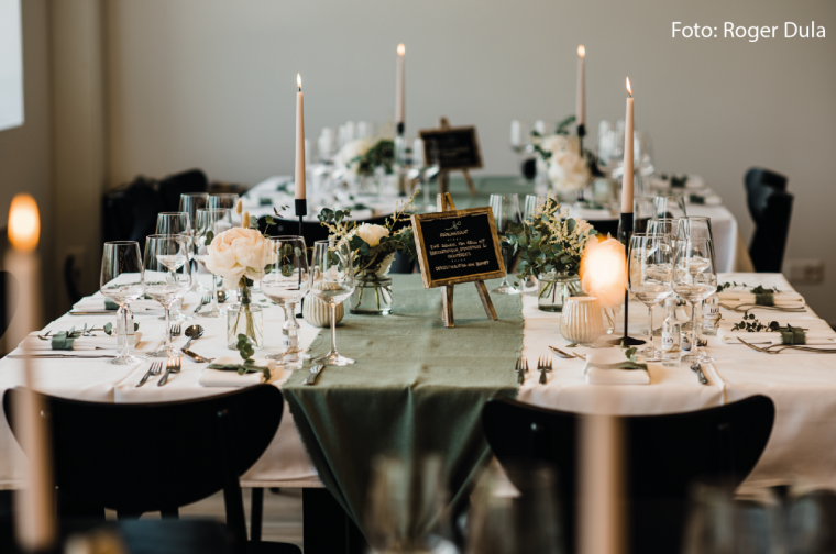 Das von A bis Z durchdachte Gesamtkonzept zeigt sich auch im Bereich der Nachhaltigkeit. Die Beschaffung des Blumenschmucks erfolgte ausschliesslich bei regionalen Partnern und mit regionalen Blumen. Auch das verarbeitete Material bestand aus wiederverwendbarem Material. Beispielsweise können die Servietten-Bandeaus weiterverwendet werden und bei der Zusammenarbeit mit der Wäscherei wurde darauf geachtet, dass diese mit umweltschonenden Standards arbeitet. Will man also kreationell in einem Wort zusammenfassen, dann könnte dies mit “Natürlichkeit” beschrieben werden. Natürliche Materialien, natürliche Formen und Farben, auf Natürlichkeit konzentrierte Prozesse sowie natürliche und authentische Freude des gesamten Teams.