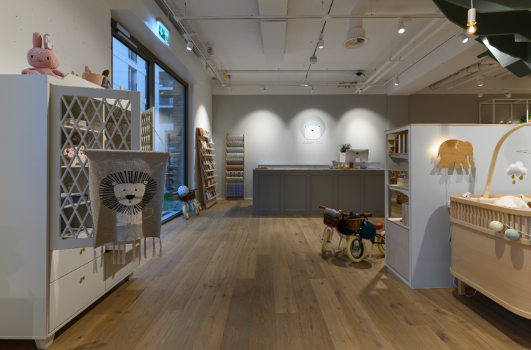 Verschiedene Zimmer-Welten im skandinavischen Stil in einem Kinder-Concept Store