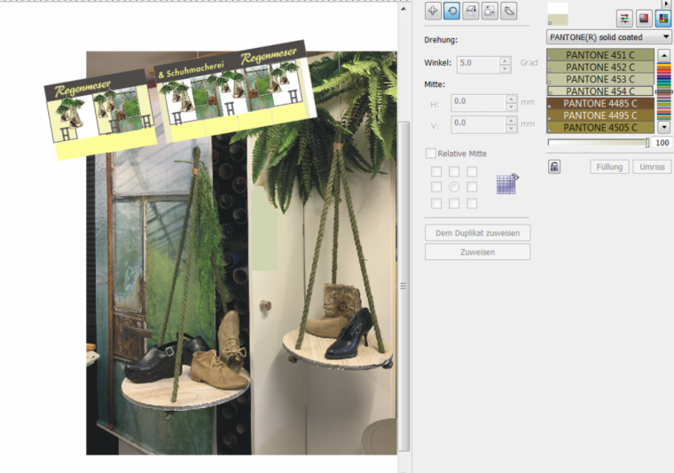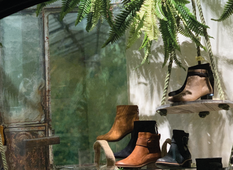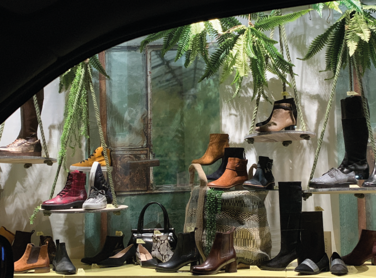 Zu ihren treusten KundInnen gehört die Familie Rogenmoser in Oberägeri, welche die Schaufenster ihres Schuhgeschäfts seit über 20 Jahren von Jacqueline gestalten lässt. So auch vor etwas weniger als einem Jahr, als die Vorgabe lediglich «Herbst» lautete. Jacqueline war es wichtig, einen Kontrast zum vorhergehenden Schaufenster zu schaffen: Im letzten Sommer war das Thema „Kakteen, Glutrot, Wüstensand“ und anschliessend kreierte sie als Zwischenfenster die „Blaue Stunde“. Das Herbstmotto sollte sich von den Vorfenstern abheben, etwas Neues sein und den Herbst emotional darstellen. Und wie immer nach einem Schaufensterwechsel war es natürlich das Ziel, die Kunden zu animieren, neue Schuhe zu kaufen. Zentral ist es für die Polydesignerin3D, bei der Gestaltung Trends einzubringen, die jedoch zum ganzen Sortiment passen. Nur auf einzelne Produkte einzugehen, ist keine Option. Da es jedoch einige vintageartige-Schuhe neu im Sortiment hatte, entschied sich Jacqueline für das Motto « tropical-colonial-vintage».