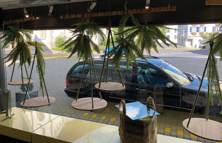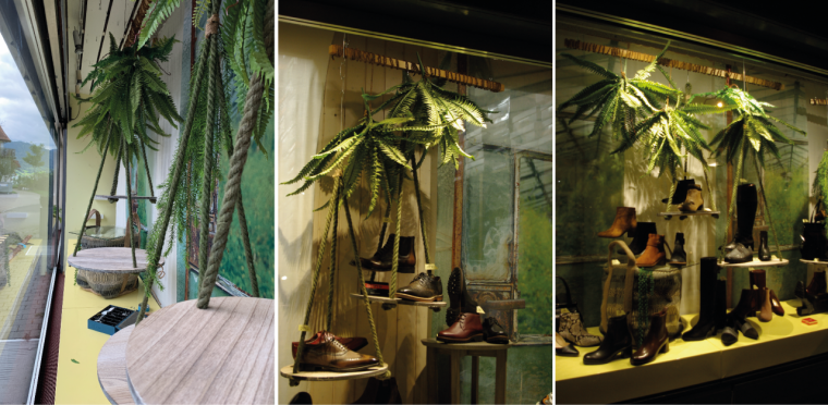 Für das Herbst-Schaufenster 2019 setzte Jacqueline diesmal nur die Kreation und das Styling um, da sie von verschiedenen Quellen Inszenierungs-Hilfen eingekauft und mit Gegenständen aus ihrem Atelier ergänzen konnte. Miteinander kombiniert erzielte sie so den gewünschten Effekt: «Die Warenträger aus der Dekorationsauflösung des Herrenglobus passten bestens zu den hängenden Warenträgern, die den Raum cool ausnutzten und so mehr Ausstellungsfläche boten», erzählt Jacqueline rückblickend. Um das Tropical-Feeling zu erreichen, ergänzte sie mit vielen grünen Pflanzen. Diese hängte die Polydesignerin3D vorab im Atelier an Holzleisten, welche vor Ort im Schaufenster an der Decke befestigt werden konnten. Als Hintergrund platzierte sie textile Drucke mit Gewächshaus-Sujets und rostigen Akzenten.